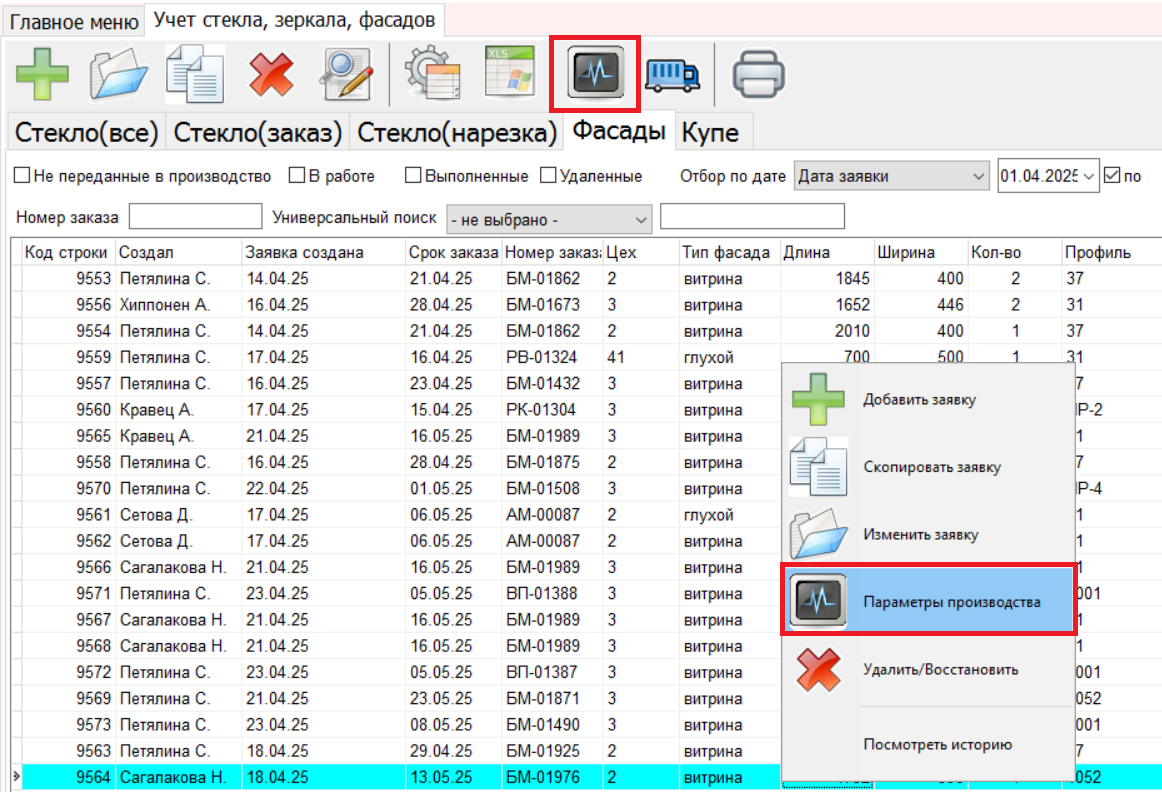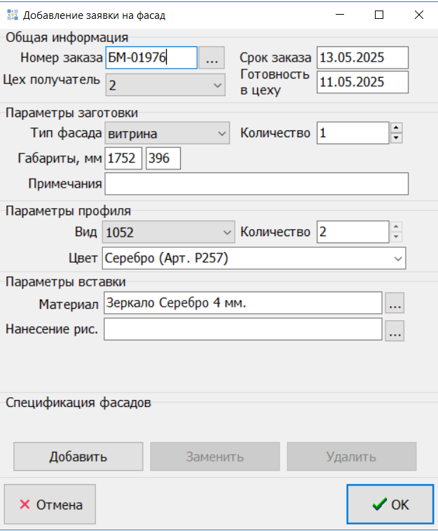 После того, как фасады на производстве будут изготовлены, в заявке необходимо проставить готовность, указать дату и исполнителей.