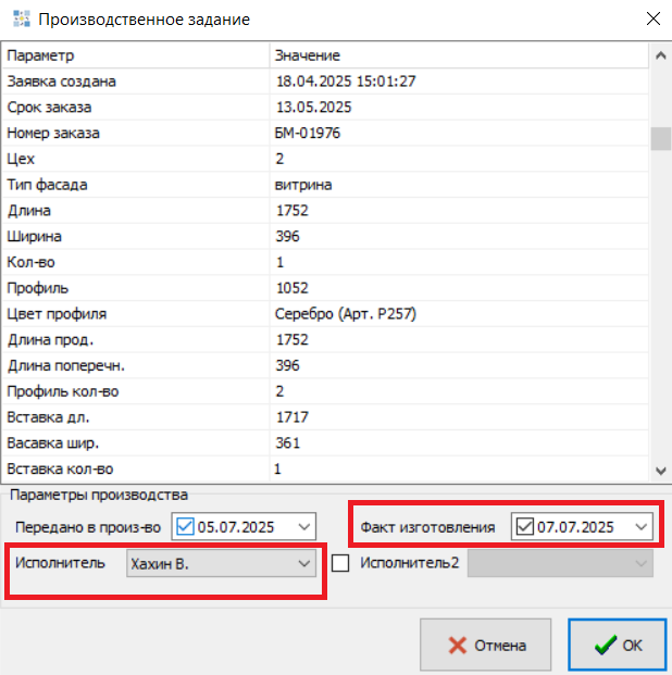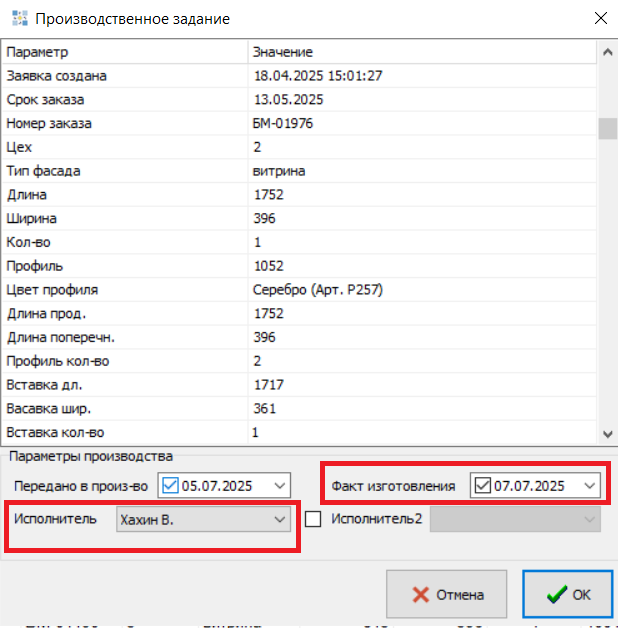 Для этого необходимо нажать кнопку «Параметры производства», установить галочку и дату в ячейке «Факт изготовления», в ячейке «Исполнитель» необходимо выбрать фамилию сотрудника, выполнившего работу.