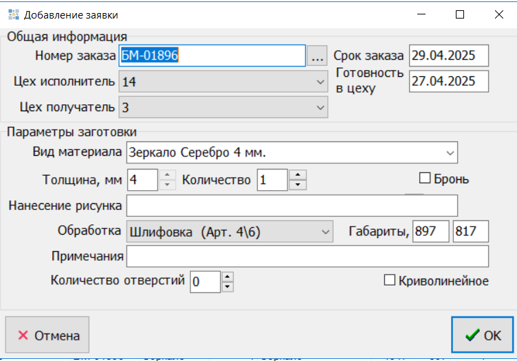 Необработанная заявка на нарезку стекла выглядит следующим образом. Здесь можно внести необходимые изменения: цех получатель, цех исполнитель, вид материала, толщина, обработка, наличие отверстий, криволинейность.