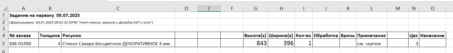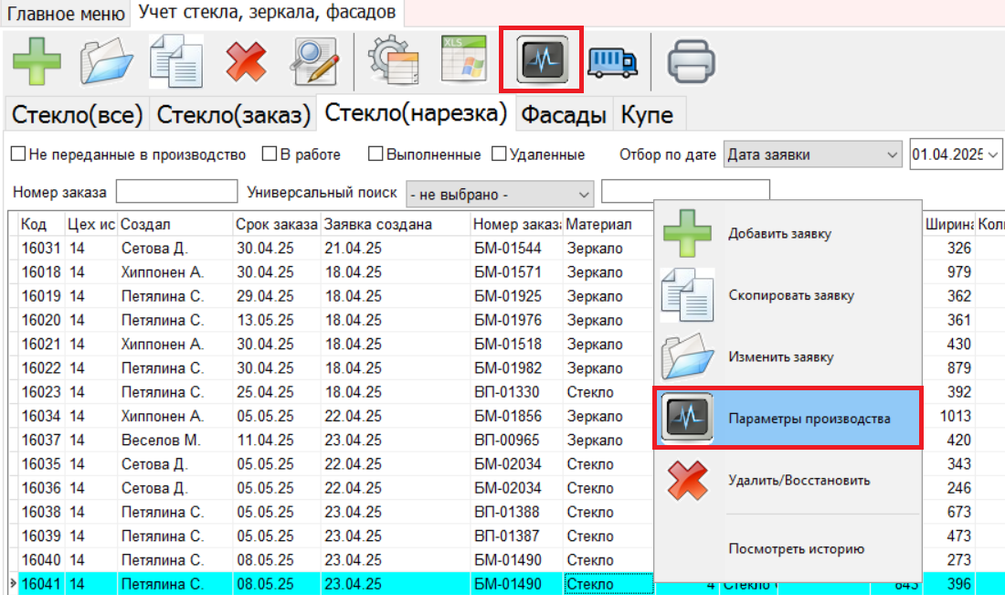 После того, как стекло на производстве будет нарезано, в заявке необходимо проставить готовность, указать дату и исполнителей.