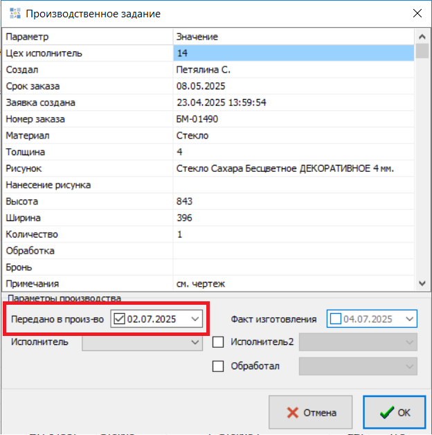 В открывшемся окне необходимо установить галочку и дату в ячейке «Передано в производство».