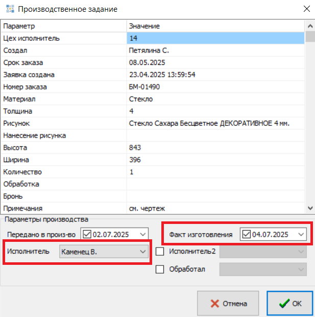 Для этого необходимо нажать кнопку «Параметры производства», установить галочку и дату в ячейке «Факт изготовления», в ячейке «Исполнитель» необходимо выбрать фамилию сотрудника, выполнившего работу.