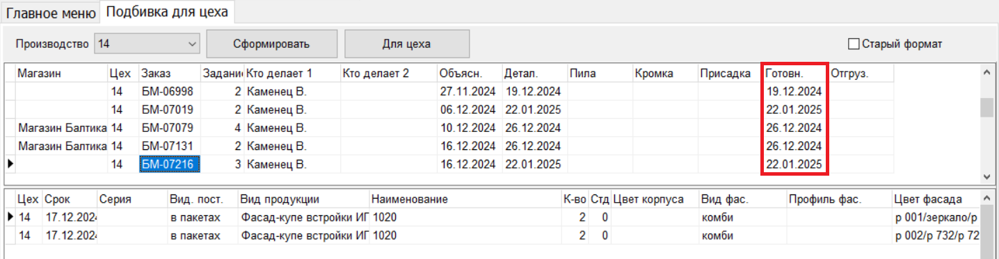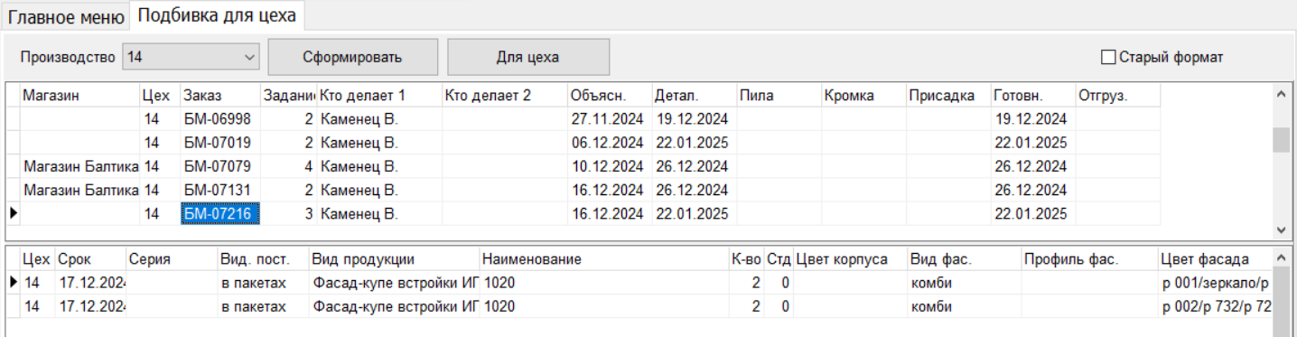 Форма заполнится списком заказов, изделия по которым находятся на изготовлении у выбранного цеха.