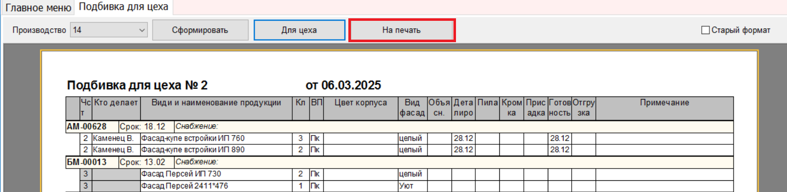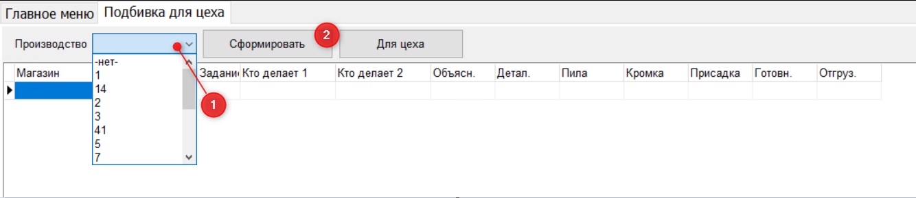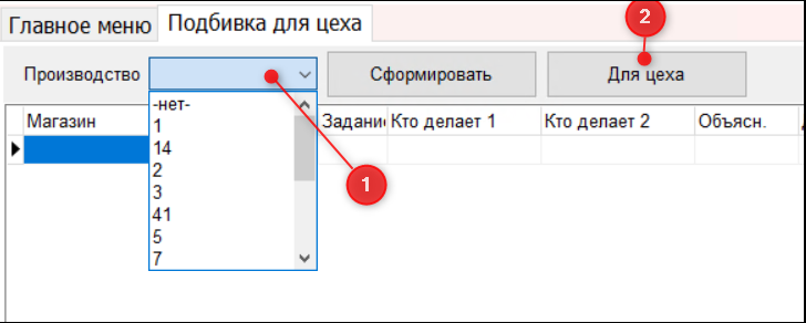 1. В режиме «Подбивка для цеха» выбрать производство;