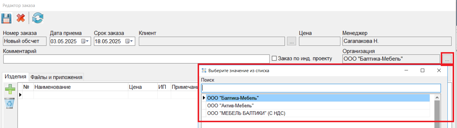 Дополнительно необходимо выбрать в редакторе заказа организацию.
