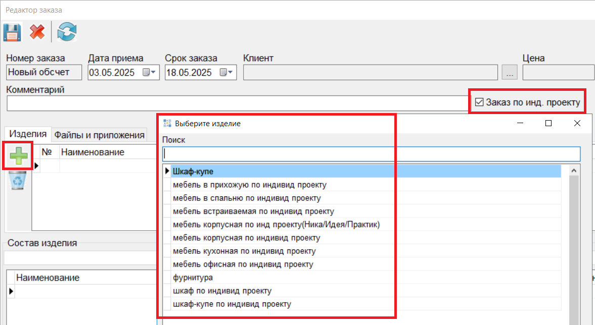 4.2 В случае, если необходимо оформить заказ на мебель по индивидуальному проекту, то следует сначала установить флажок «Заказ по инд. проекту», далее нажать на кнопку «+» в блоке «Изделия» в редакторе заказа и выбрать вид изделия.