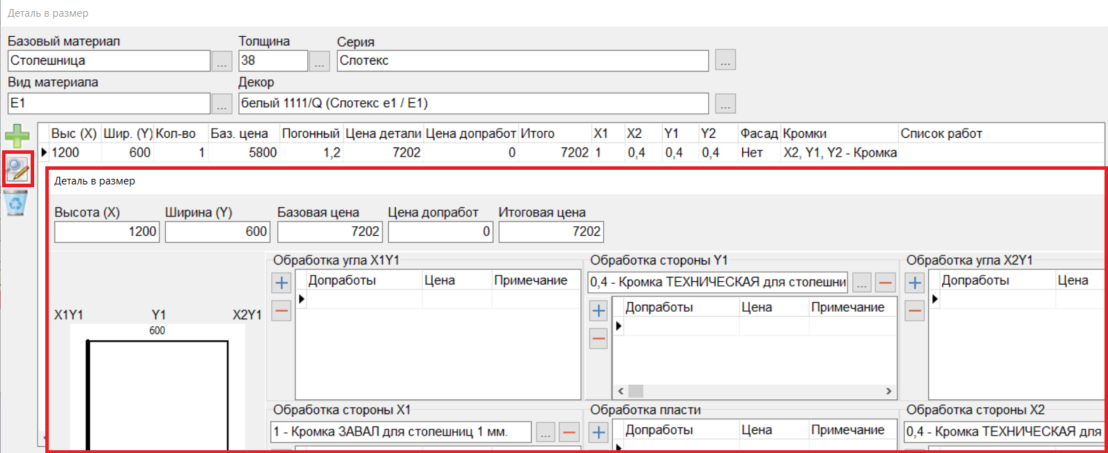Для этого, установите курсор на детали и нажмите кнопку «Изменить деталь». После этого откроется редактор детали, где можно внести изменения и указать вид доп. работ: скос угла, скругление угла, еврозапил и др.