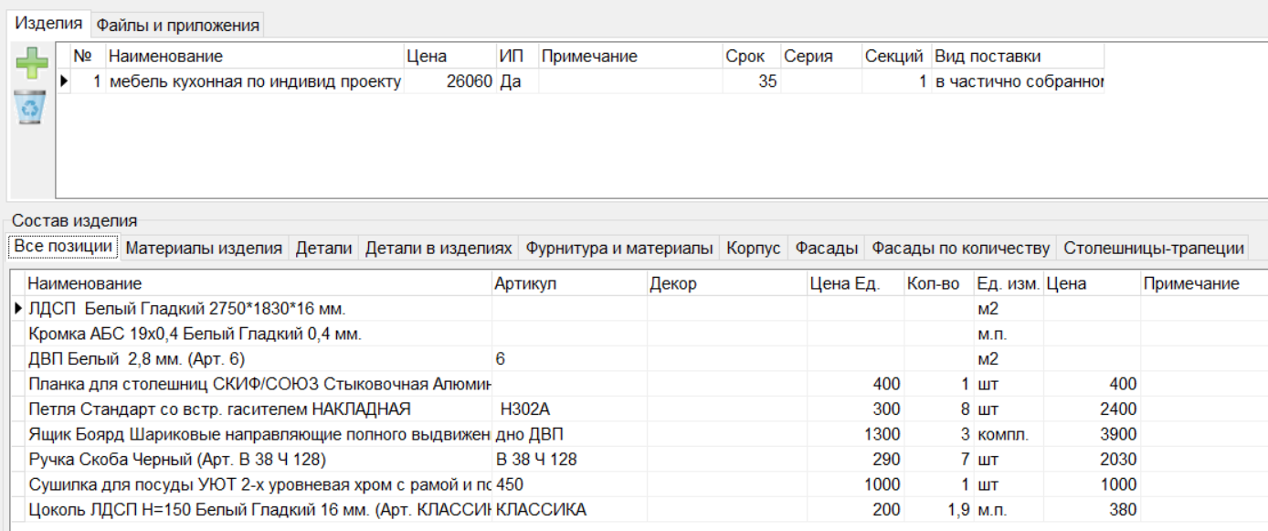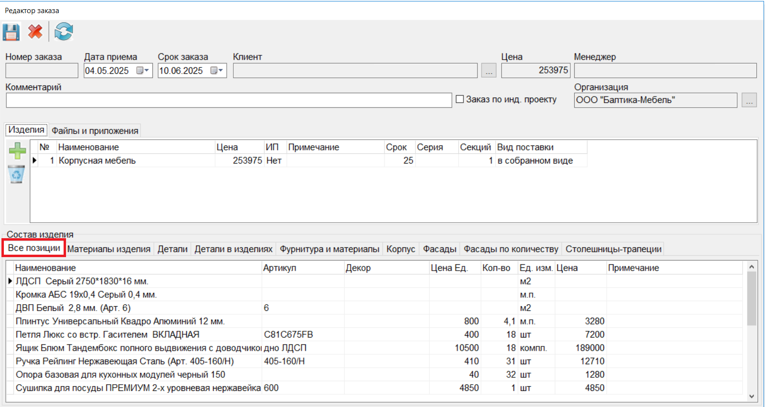 Во вкладке «Фурнитура и материалы» отображаются соответствующие позиции заказа.