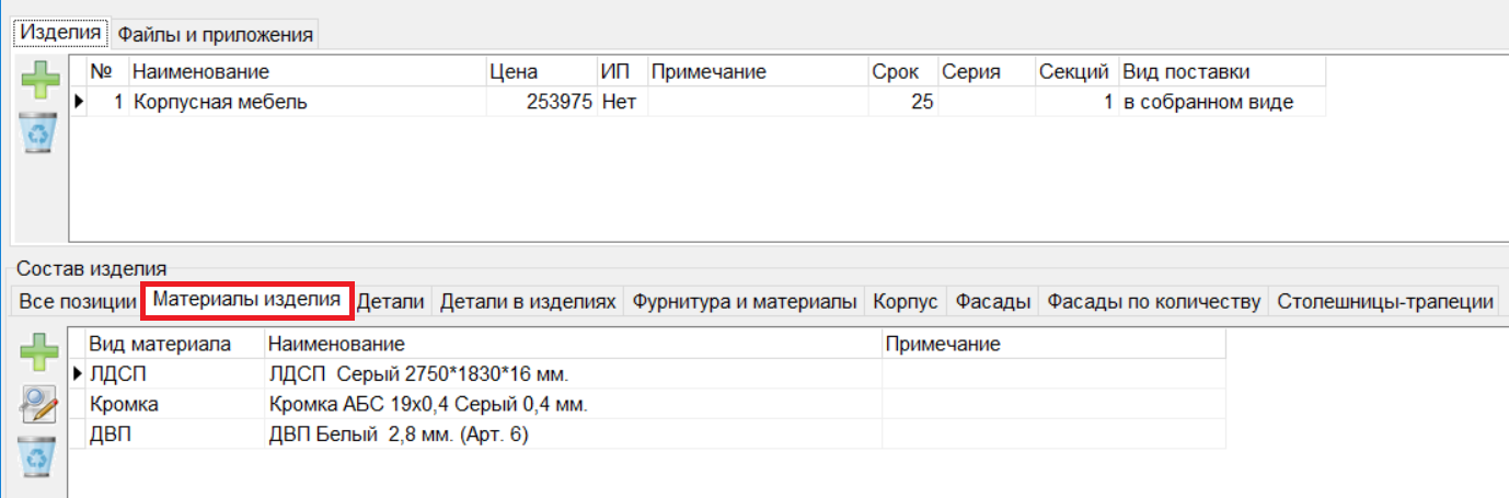 Во вкладке «Материалы изделий» отображаются все материалы, которые содержатся в заказе.