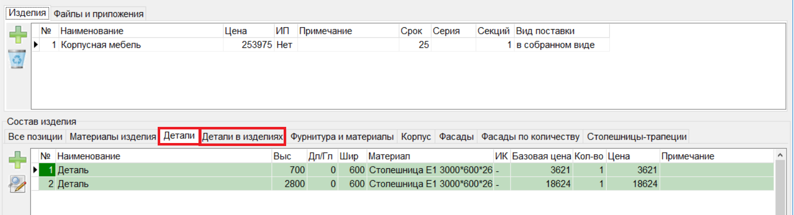 Во вкладке «Детали в изделиях» отображаются те детали, которые нужно будет включить в конструктив изделия, а не пилить отдельно. Это может быть дополнительная полочка или ящик в составе изделия.