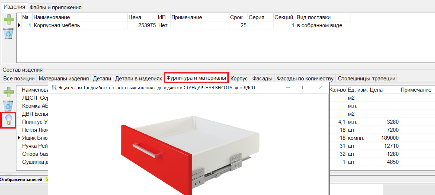 Также здесь можно просмотреть изображение и описание фурнитуры, нажав кнопку «Лампочка».