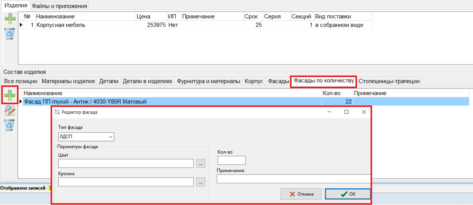 Для того, чтобы добавить новые фасады, следует нажать кнопку «+».