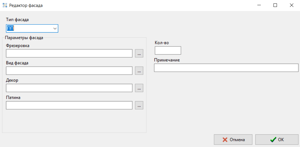 1. Параметры фасада: Фрезеровка, Вид фасада, Декор, Патина