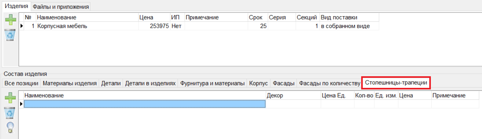 Во вкладке «Столешницы-трапеции» будут отображаться столешницы-трапеции, если они содержатся в заказе.