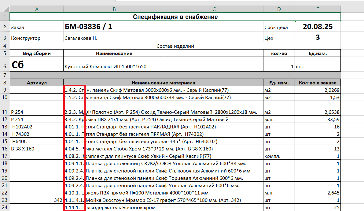 4. В спецификации на снабжение настроена сортировка материалов по алфавиту общая, включая кромки и нумерацию. (#8143)
