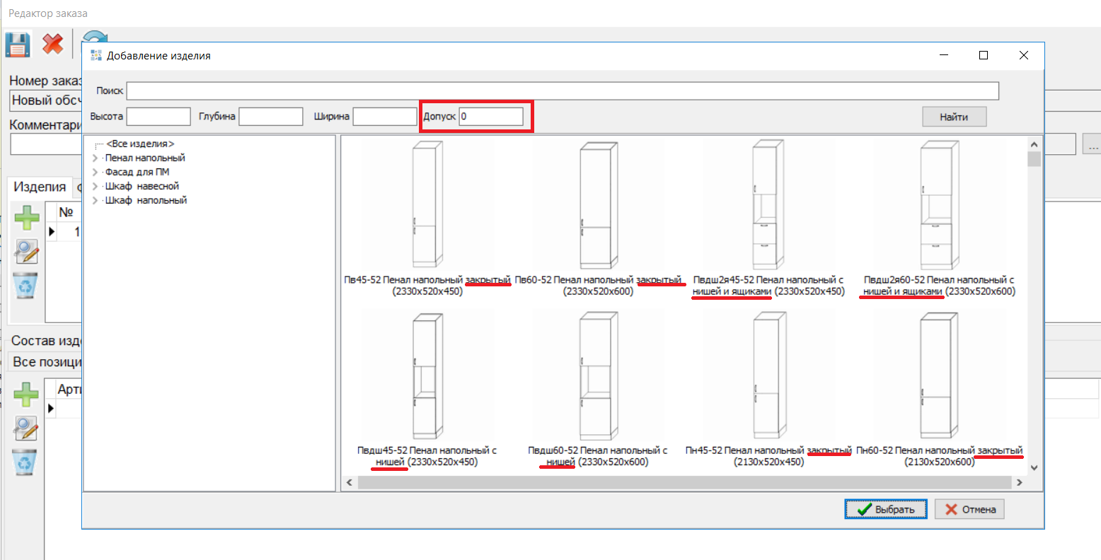 - В списке подбора установлен допуск = 0.