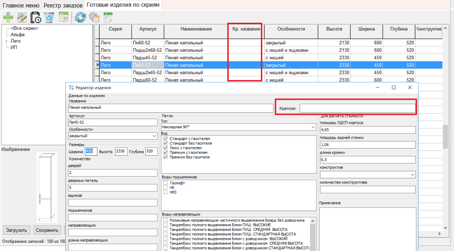 - В справочник "Готовые изделия" добавлено поле "Краткое наименование". Краткое наименование выводится во вкладке "Корпус". Если поле не заполнено - используется Наименование, как раньше.