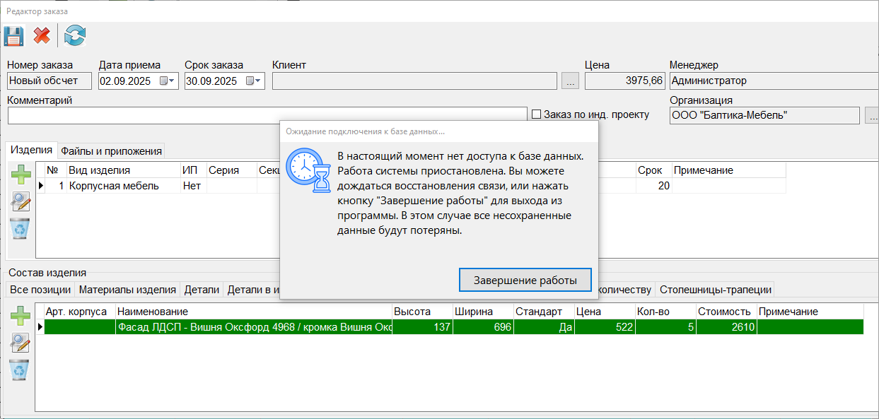 2. Решена проблема несохранения данных заказа при разрыве соединения VPN. При возникновении ошибки работы с базой данных на экран выводится сообщение "В настоящий момент нет доступа к базе данных. Работа системы приостановлена. Вы можете дождаться восстановления связи, или нажать кнопку "Завершение работы" для выхода из программы. В этом случае все несохраненные данные будут потеряны" с кнопкой "Завершение работы". Можно завершить работу программы и тогда данные заказа сохранены не будут, либо дождаться восстановления соединения в течение минуты и тогда данные заказа будут сохранены. (#8090)