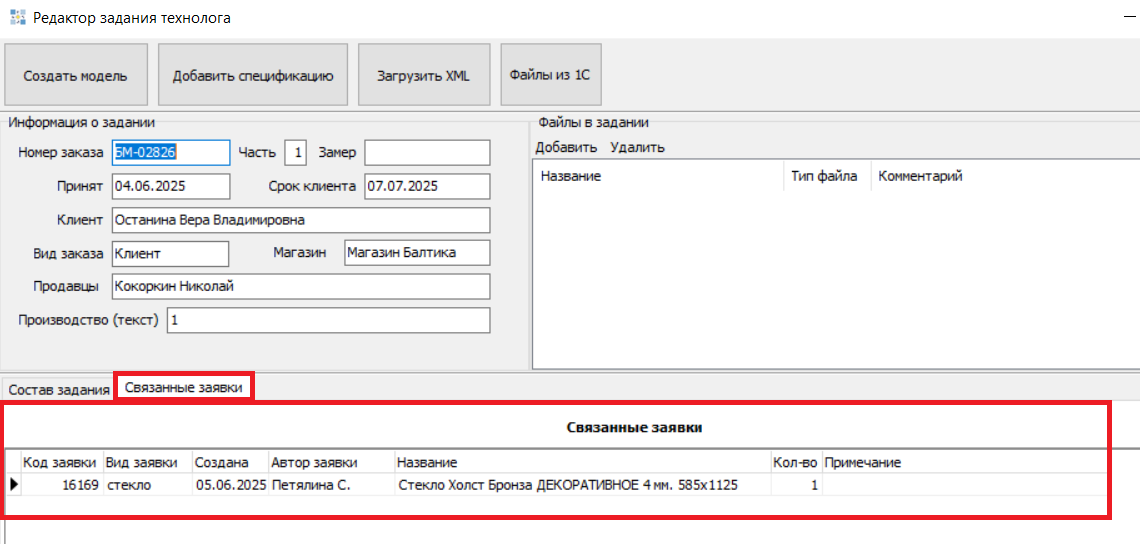 Добавлена вкладка "Связанные заявки", на этой вкладке отображаются все заявки, которые привязаны к этому заказу из режима "Учет стекла/зеркала/фасадов".