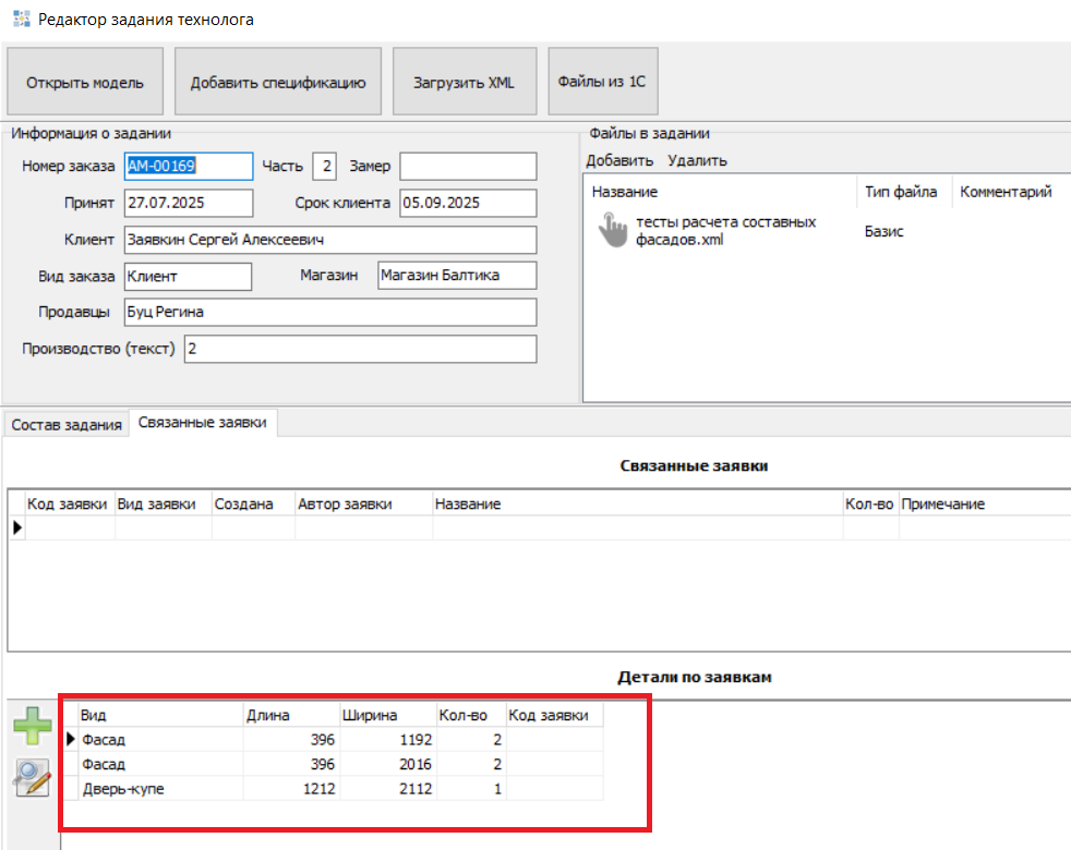 На вкладке "Связанные заявки" в нижней части добавлена таблица - Детали по заявкам. В момент загрузки XML из файла считываются специальные материалы по кодам и по данным материалам создаются записи в таблице, например: