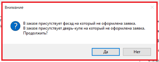 В момент сохранения Задания КБ, а также в момент перевода его в статус "Выполнено" система сравнивает количество по Заявкам, привязанным к данному заказу, с количеством по таблице "Детали по заявкам" по каждой группе (фасады, нарезка, купе). Если количество заявок меньше, чем ожидается - выводится сообщение вида: "В заказе присутствует стекло (фасад, дверь-купе) на который не оформлена заявка. Продолжить?". Если нажать "Да" - тогда операция выполняется, если нет - то отменяется. (#8118)