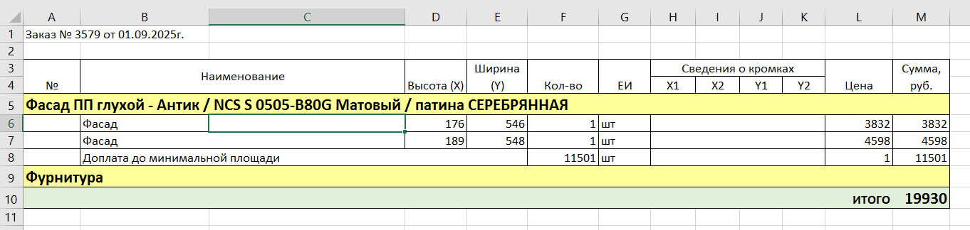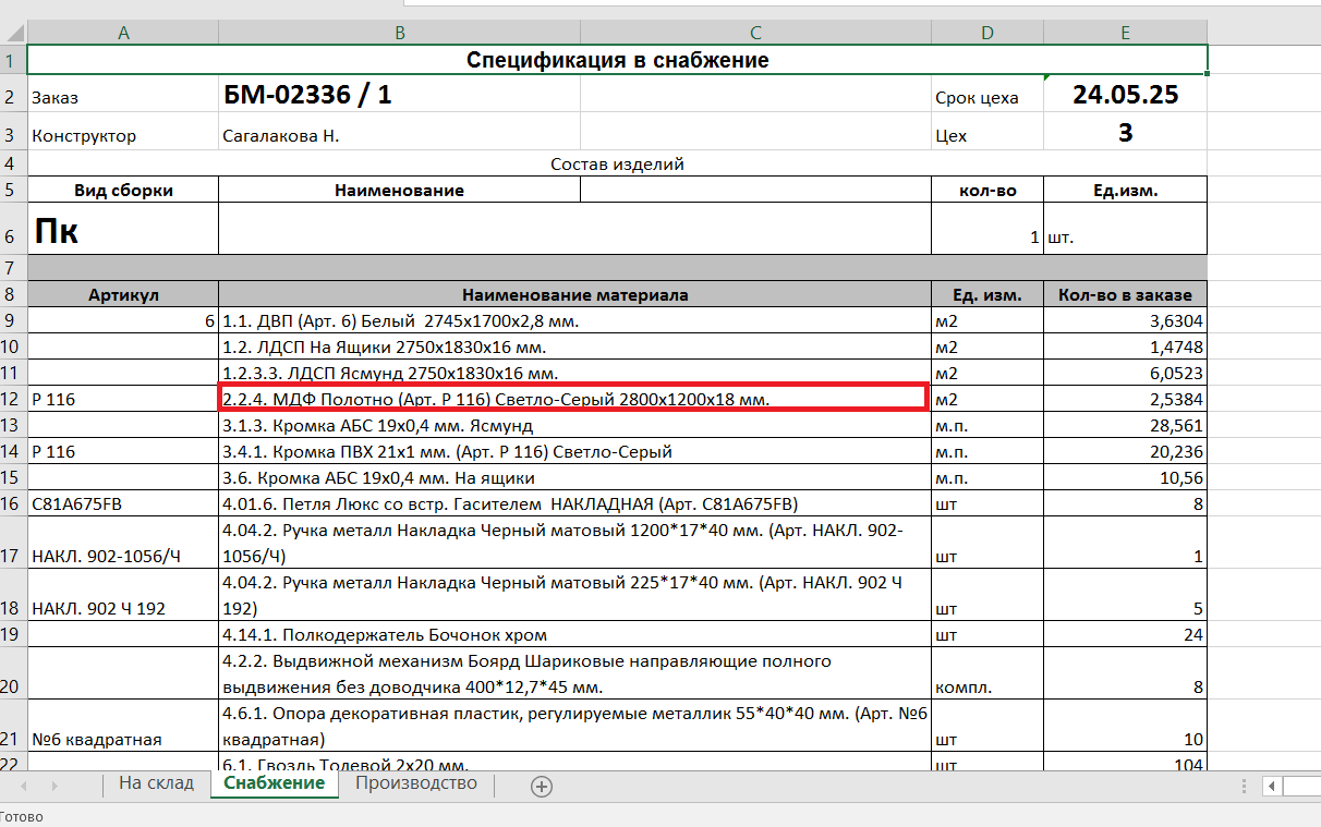 - При выводе в печатную форму в Excel позиции по заказу сворачиваются раздел "Фурнитура и материалы" по одинаковым позициям, и указывается общее количество. (#8175)