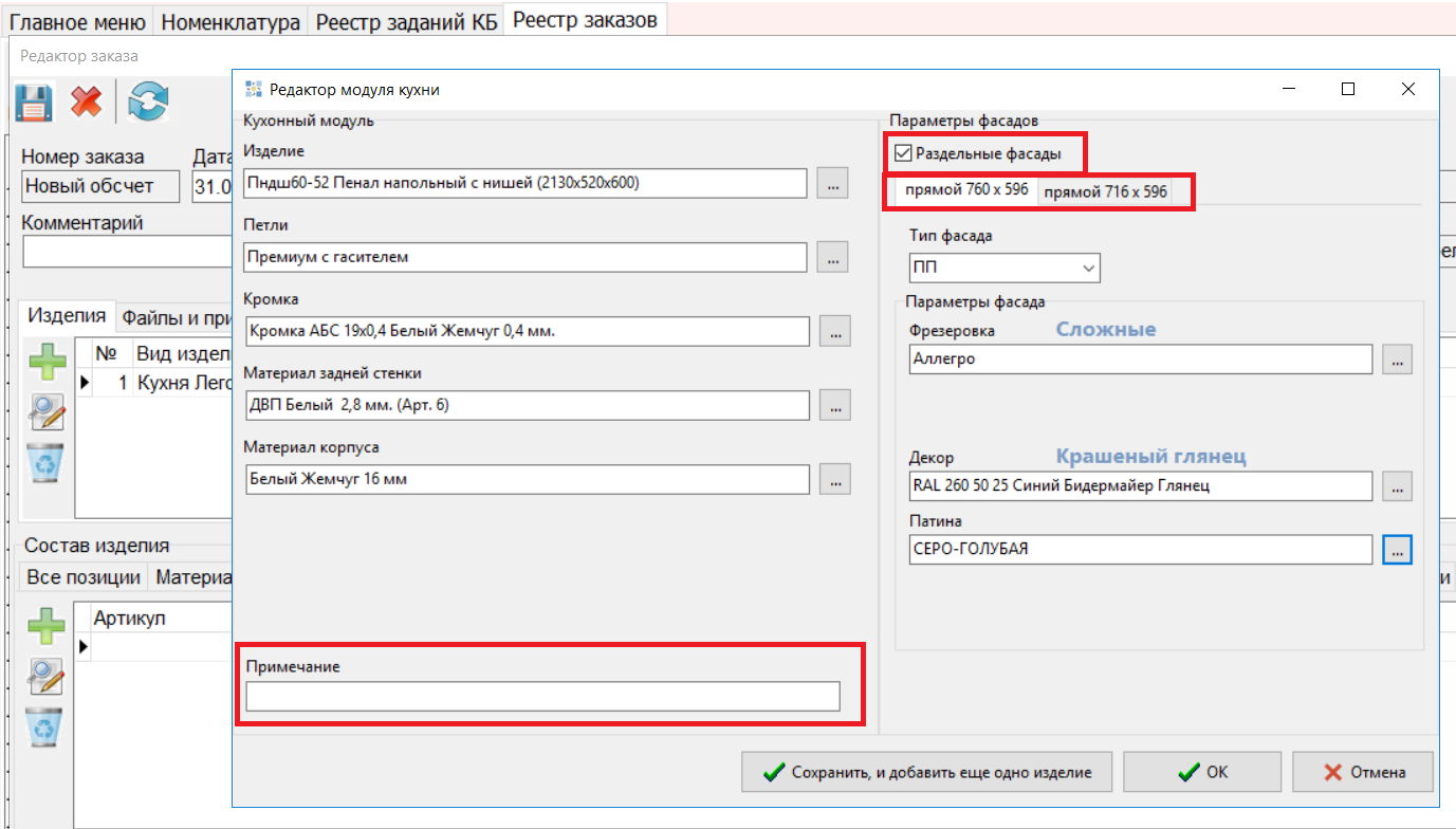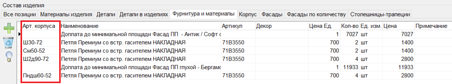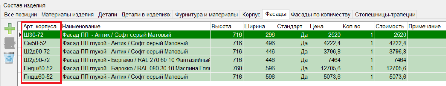 - Для фасадов и фурнитуры и материалов добавлена колонка "Артикул корпуса".