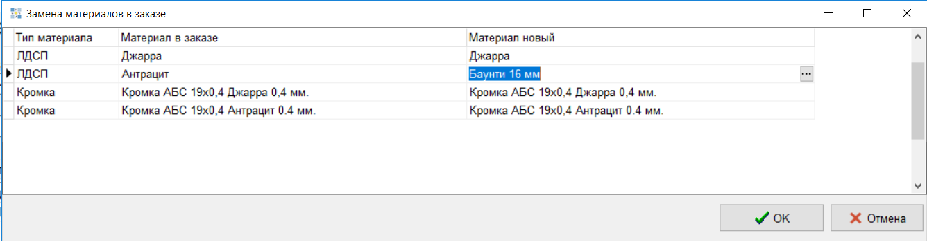 Пользователь выбирает категорию для замены, после чего на экране отображается окно «Замена материалов в заказе». В данном окне необходимо выбрать материал для замены в столбце «Материал новый» и нажать «ОК».