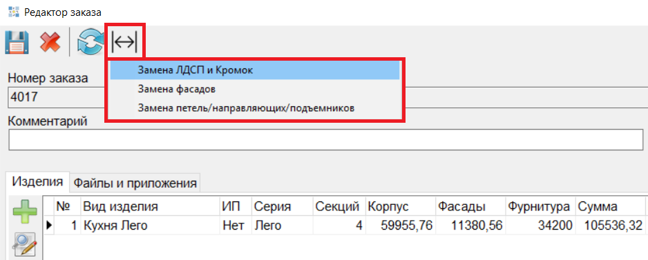 1. Реализован механизм замены материалов в Редакторе заказа: