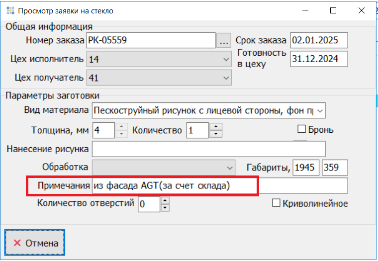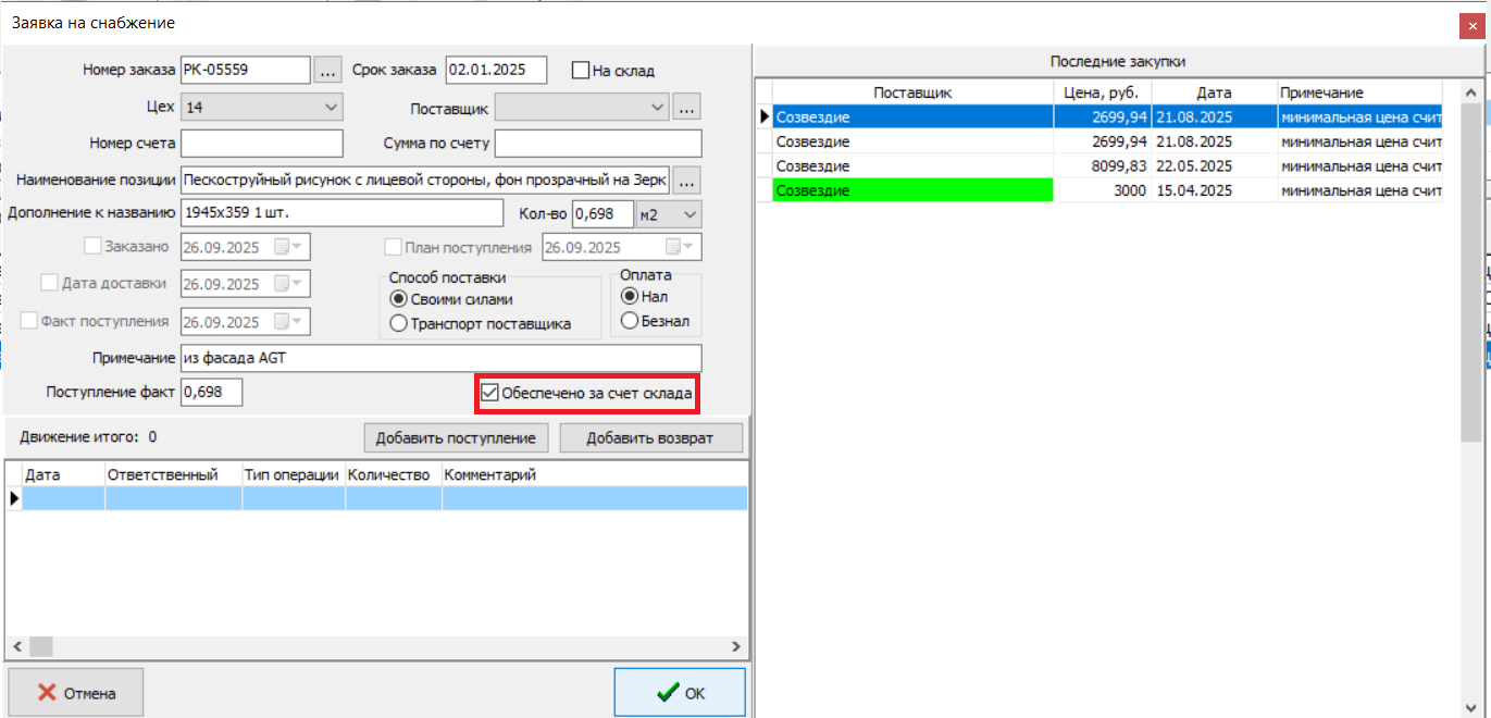 Когда в заявке на снабжение устанавливается галочка «Обеспечено за счет склада», задание, содержащее материал «Пескоструйный рисунок» не попадает в раздел Стекло(нарезка), а остается в заказных, комментарий в заявке дополняется текстом "(за счет склада)". (#8229)