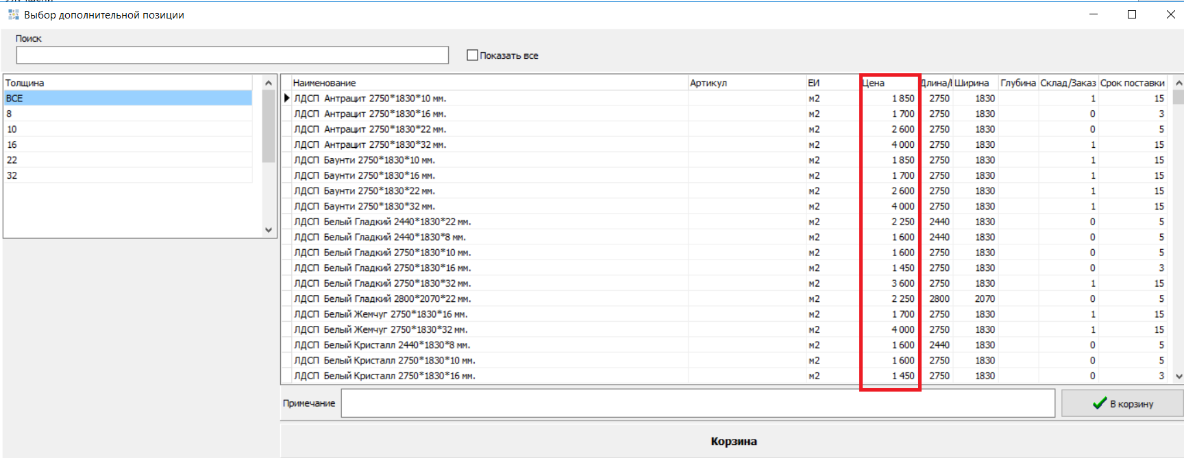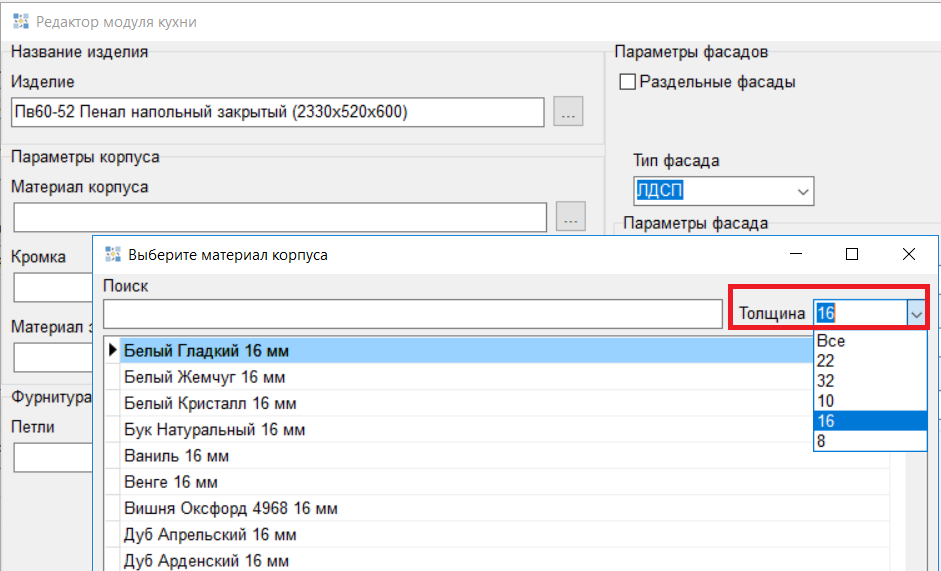- При выборе ЛДСП добавлена возможность выбора толщин сверху при выборе цветов, значение 16мм установлено по умолчанию.
