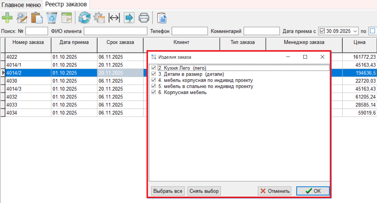 10. Реализована возможность выбора изделия при печати спецификации по Заказу. В Excel выводится спецификации только по выбранным изделиям. (#8253)