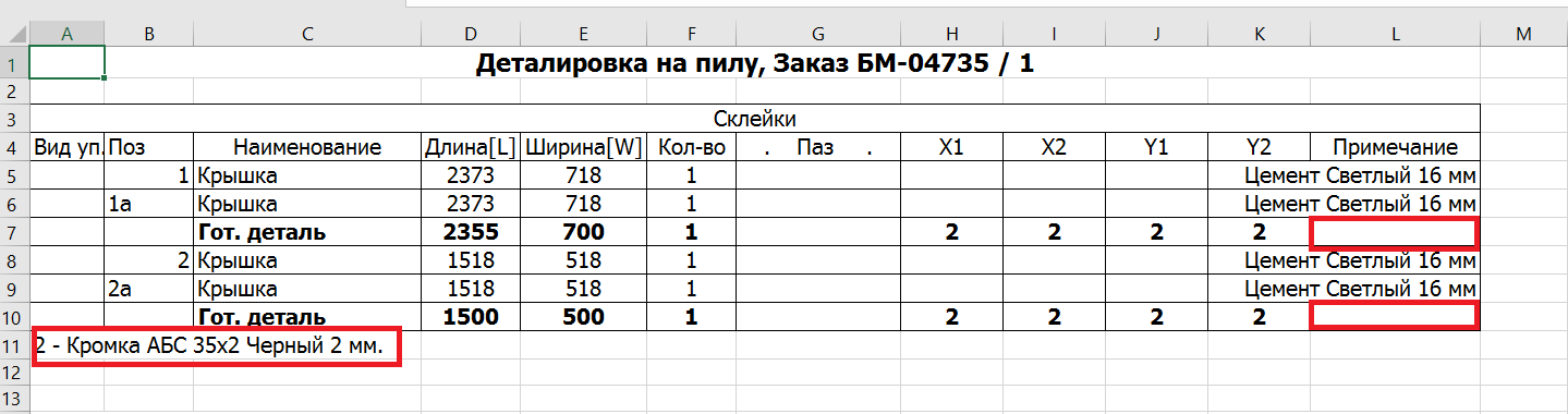 - Описание кромки отображается в полях X,Y только для готовой детали;