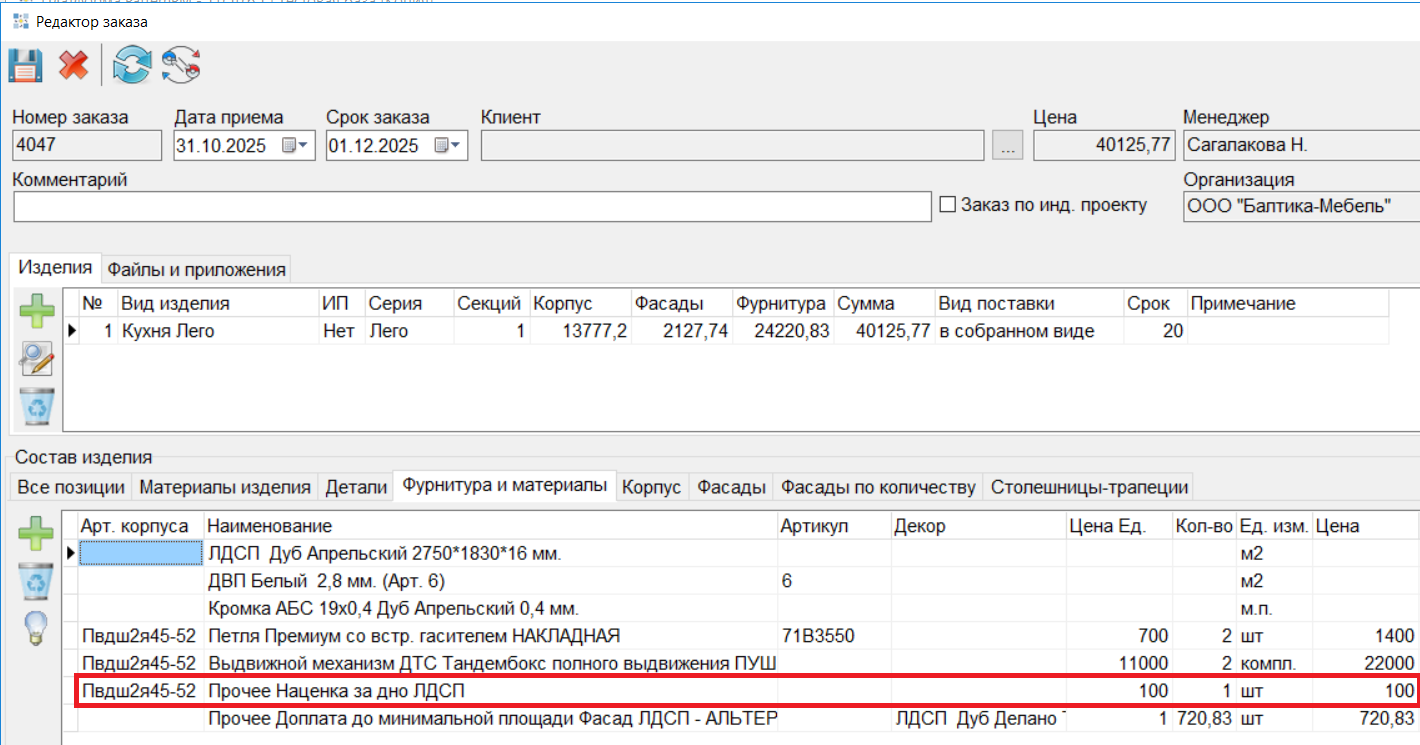 В системных параметрах добавлена настройка «Номенклатура для расчета цены дна ЛДСП». Если в заказе в изделии было выбрано дно ЛДСП, то в состав изделия на вкладку «Фурнитура и материалы» будет добавлена позиция «Прочее Наценка за дно ЛДСП». (#8210)