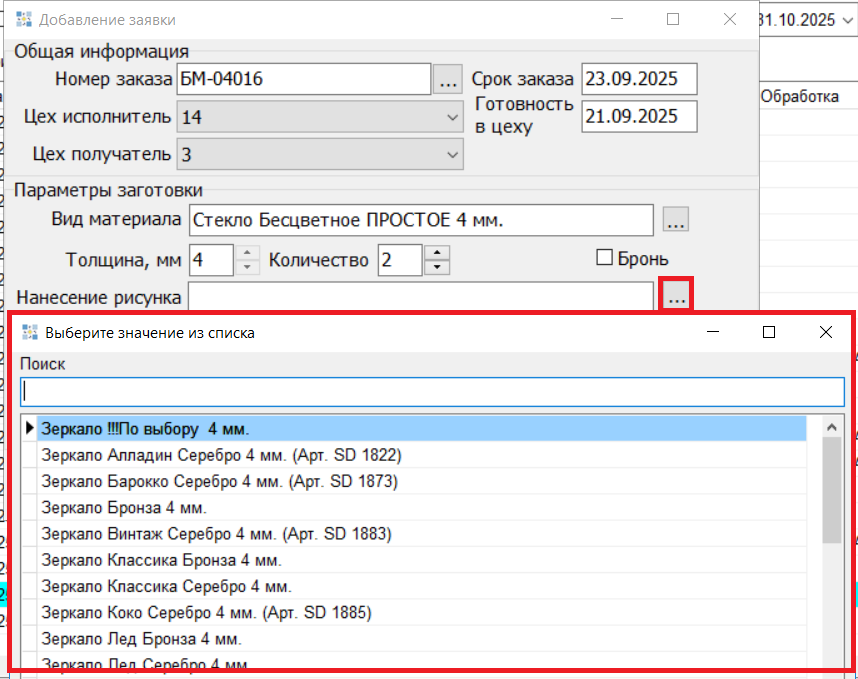 В заявках на нарезку реализован выбор материала через окно подбора. (#8285)