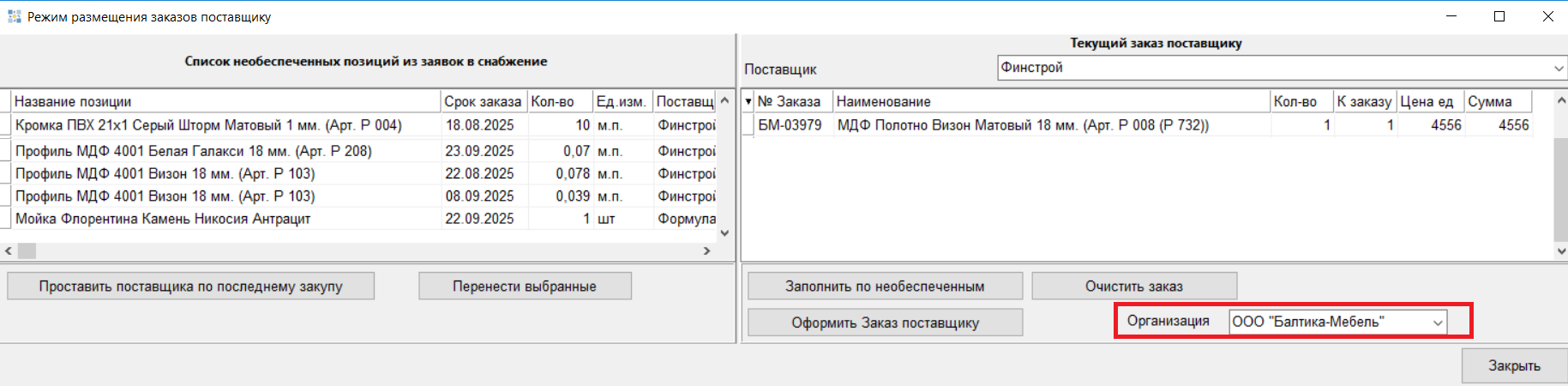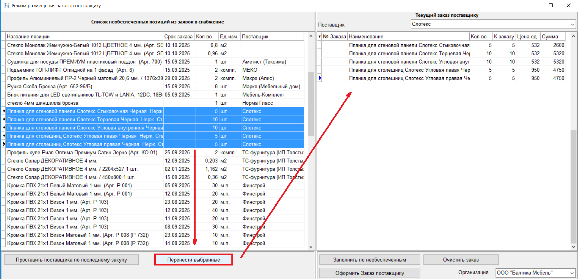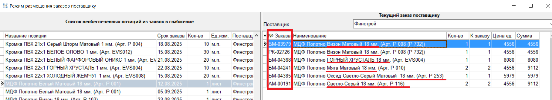 1.6 Реализована возможность выбора в списке Заявок нескольких позиций и их переноса в Заказ поставщику. Выбирать позиции необходимо с зажатой клавишей Ctrl.