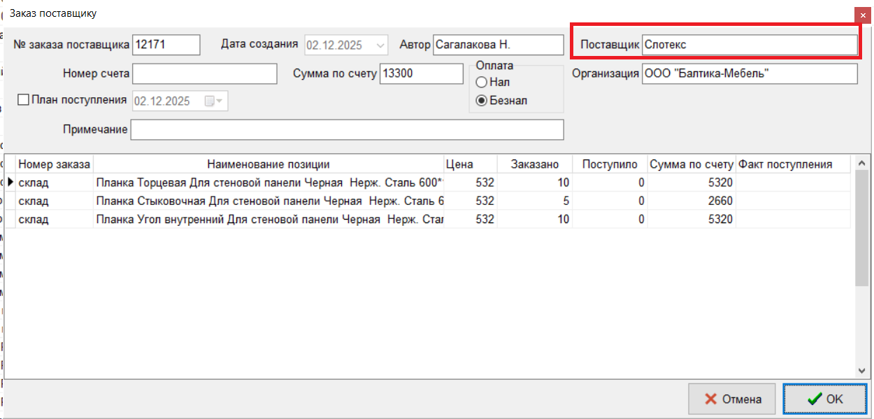 1.3 Добавлено поле «Поставщик» в окне «Заказ поставщика».
