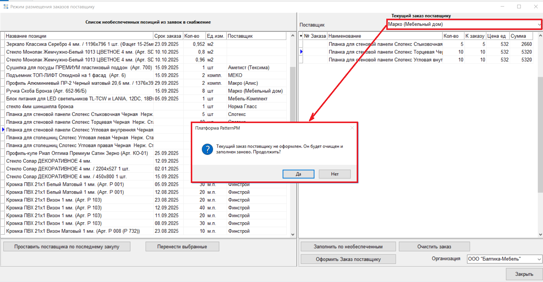 "Текущий заказ поставщику не оформлен. Он будет очищен и заполнен заново. Продолжить?".