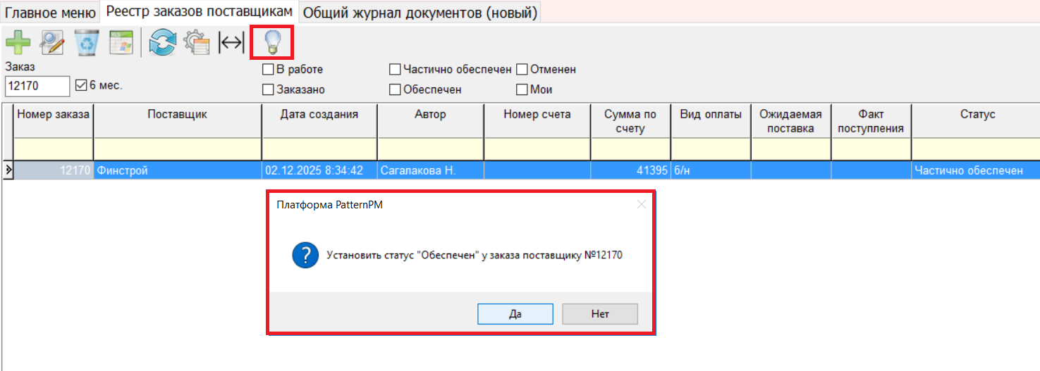 1.5 Создана возможность установки статус у заказа поставщику «Обеспечен» вручную в том случае, когда поставщик привез только часть заказа и больше поставок не ожидается.