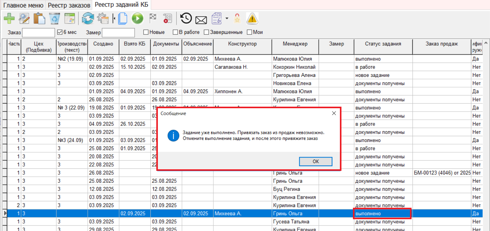 3. Настроен запрет на привязывание заказа продаж к Заданию КБ, если статус Задания КБ – Выполнено. При попытке привязать заказ в таком случае выйдет сообщение:
