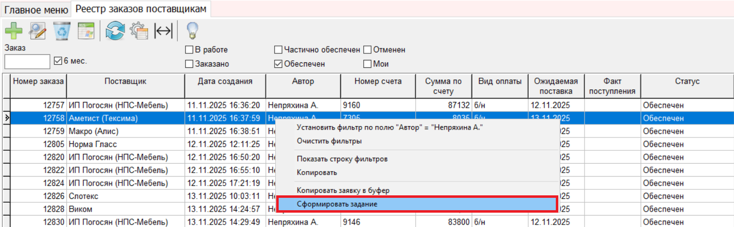 4. Процедура формирования задания на доставку перенесена из Реестра заявок в Реестр заказов. Пункт меню по правой кнопке - Сформировать задание. (#8324)