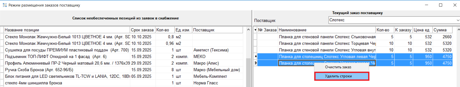 1.7 Реализована возможность удаления строк из раздела «Текущий заказ поставщику». Для этого необходимо выделить строки с зажатой клавишей Ctrl, щелкнуть правой кнопкой мыши – Удалить.