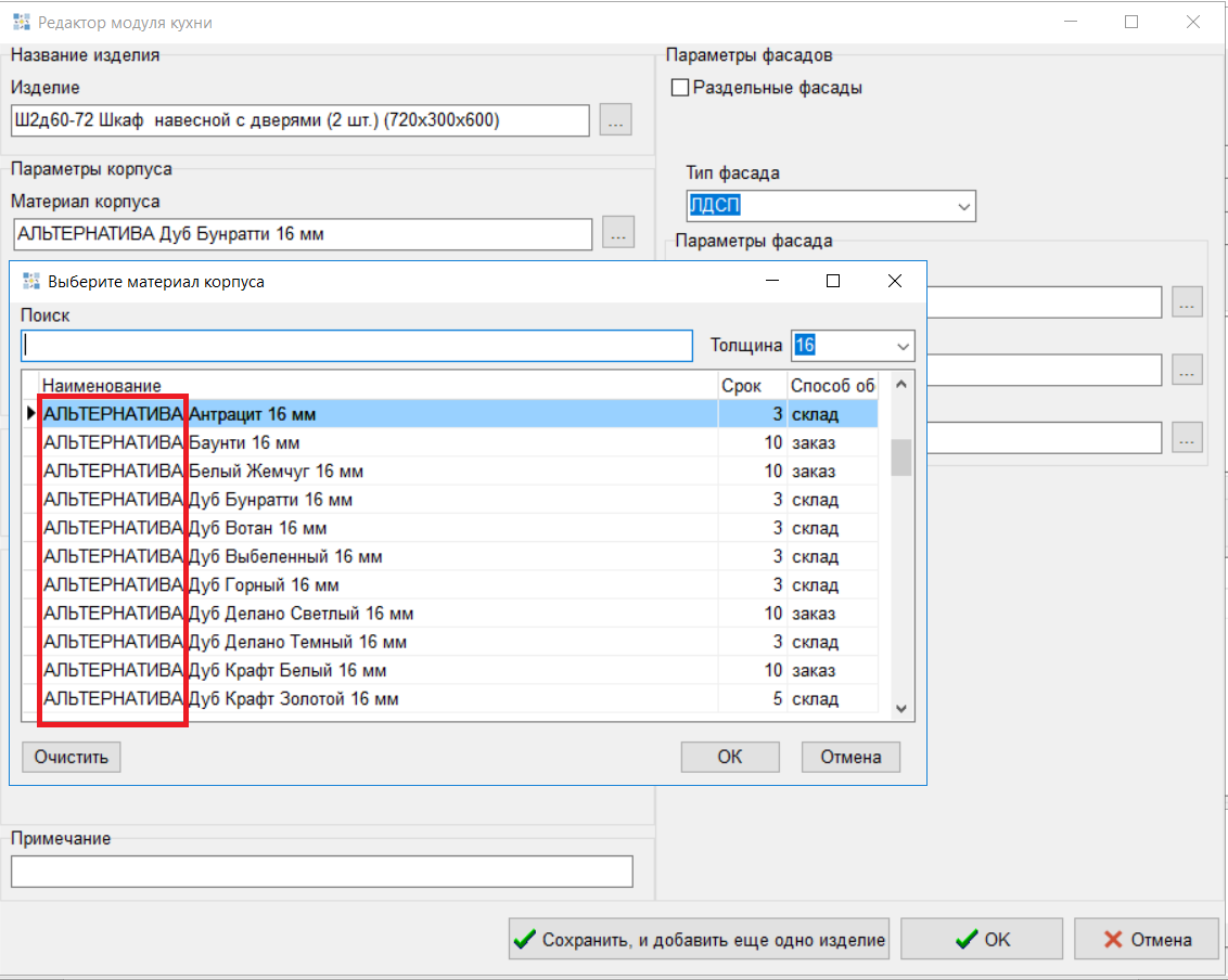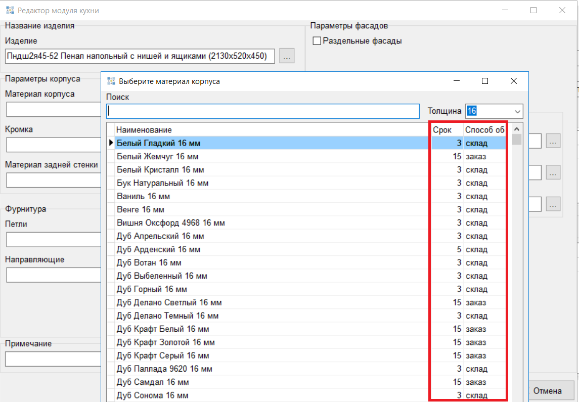 5. Реализовано отображение сроков и способа обеспечения в окнах подбора материалов фасадов. (#8326)