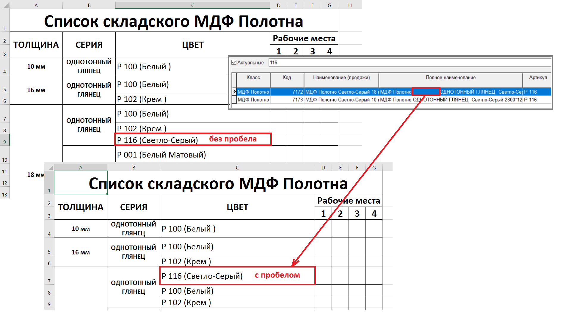 1. В образцах не отображалась позиция с артикулом p116. Выявлено, что это происходило из-за лишнего пробела в названии серии.