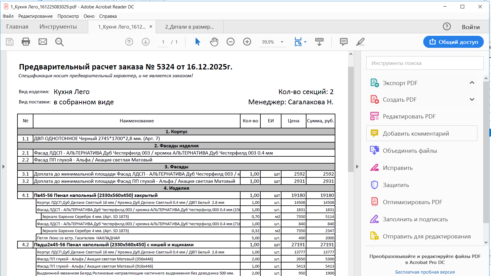 2. Устранена ошибка отображения стоимости наполнения фасадов в общей сумме заказа в спецификации, добавлено отображение доплаты. (#8372)