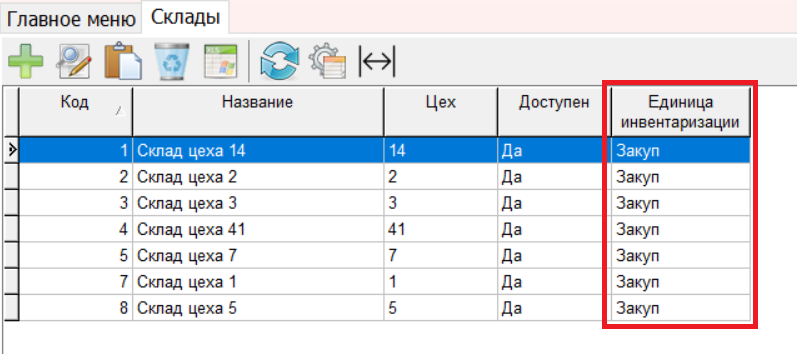 Для этого в справочник складов добавлен признак «Единица инвентаризации», варианты заполнения-Закупка, Учет (по умолчанию).