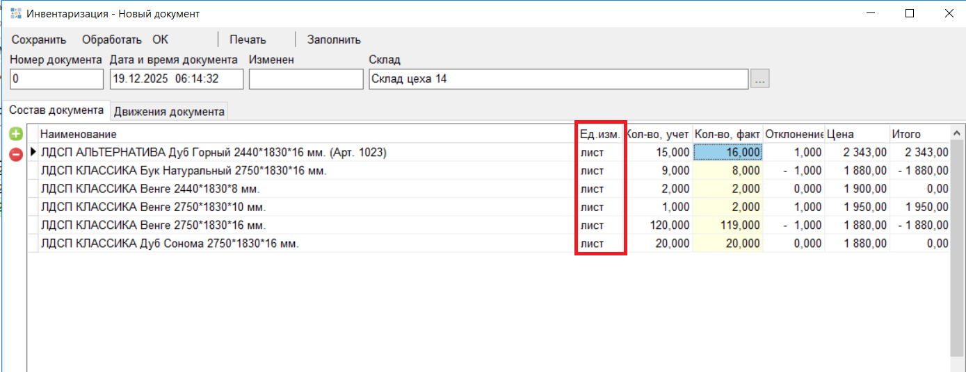 В документе «Инвентаризация» при выборе склада остатки заполняются в единицах измерения в соответствии с выбранной единицей измерения в справочнике «Склады».