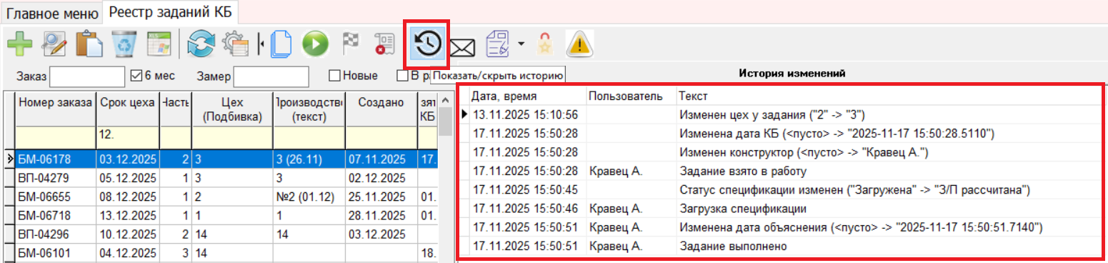 8. Доработан инструмент отображения истории, фиксирующей действия пользователя с Заданием КБ. Добавлена дополнительная информация – новый статус, сотрудник. (#8369)