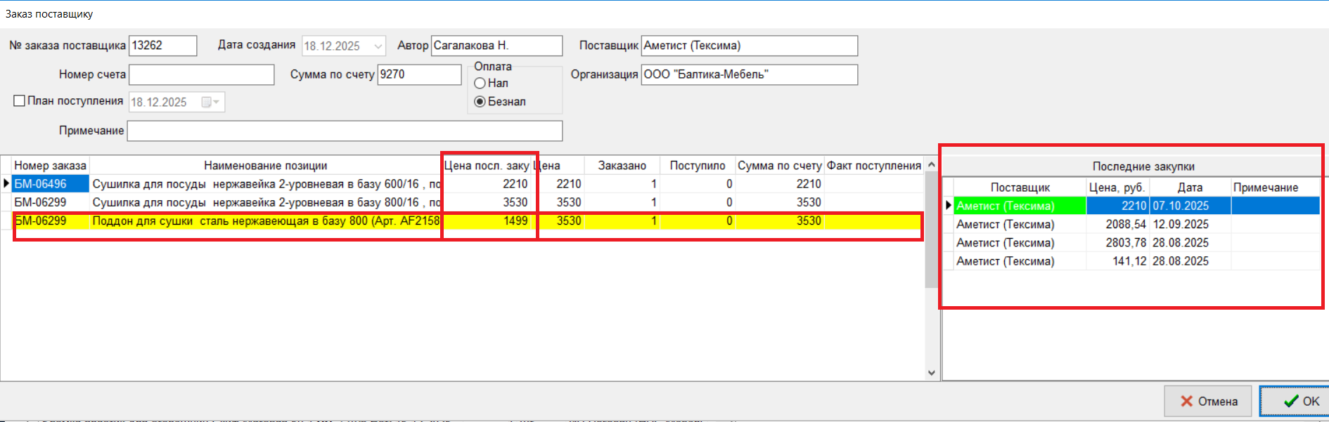 9.4 Справа от Заказа поставщика отображается окно с последними ценами закупки, аналогично Заявке в снабжение, является информационным. (#8371)