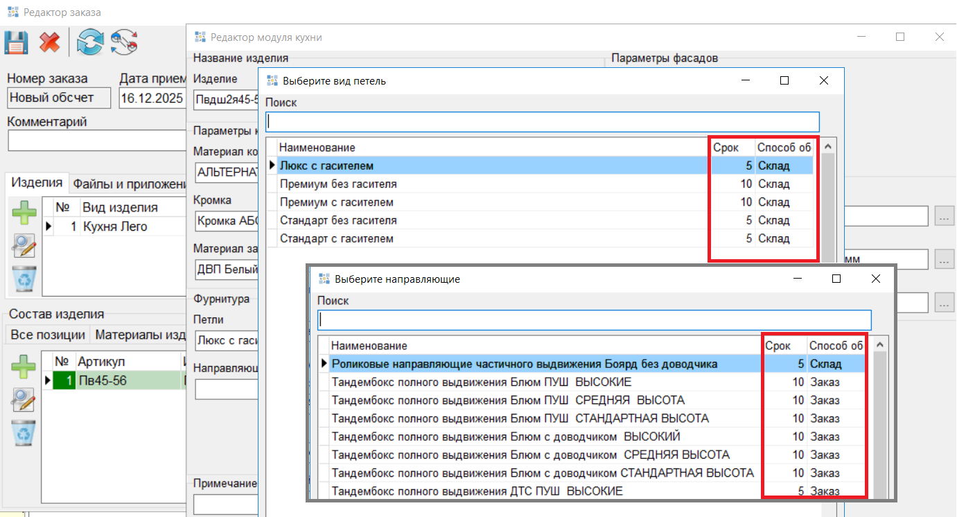 14.1 При подборе в редакторе Изделия петель и Направляющих добавлен срок поставки и статус.